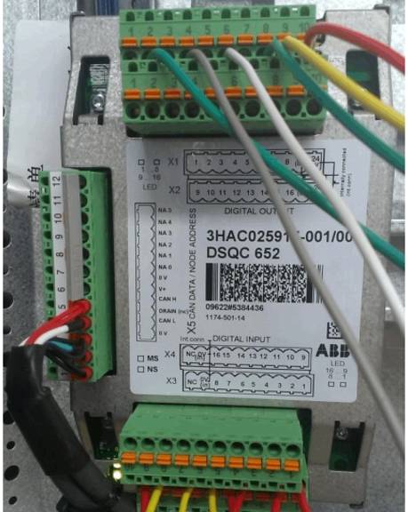 圖所示為 DSQC652通訊板,上下各有兩排端子,包含16個數(shù)字輸入和16個數(shù)字輸出,每一個接口對應一個地址,例如X1.1對應數(shù)字輸出0號地址(do0),X1.2 對用數(shù)字輸出1號地址(do1),X3.1對應數(shù)字輸入0號地址(di0),X3.2對應數(shù)字輸入的1號地址(di1),依此類推下去。每個端子排的9接 703 號線(COM),10接704號線(+24V)。